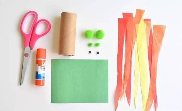 纸筒、皱纹纸、卡纸、棉花球、手工眼睛、固体胶、剪刀