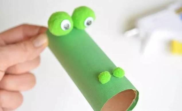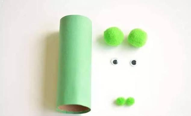 3.将手工眼睛粘贴在棉花球上,然后将棉花球粘贴在纸筒上