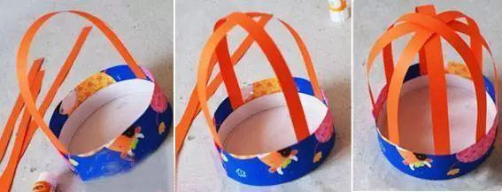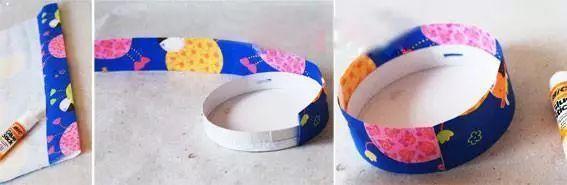第二步:另外选择一种彩纸折出一根长条,粘贴固定在废弃圆盒的底盘边缘。