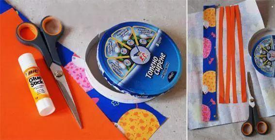 材料:废旧圆铁盒或者纸圆盒,剪刀,胶棒,彩纸。